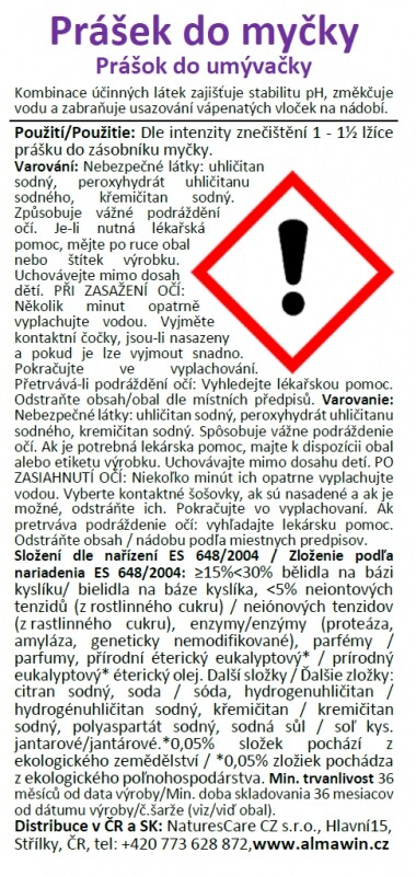 > = 15-30% Sauerstoffbleichmittel, <5% nichtionische Tenside (pflanzliche Zuckertenside), Enzyme (Protease, Amylase, ohne GVO), Duftstoffe (natürliches ätherisches Eukalyptusöl *). Natriumcitrat, Soda, Natriumhydrogencarbonat, Natriumsilikate, Natriumsalz der Polyasparaginsäure, Natriumsalz der Bernsteinsäure. * 0,05% der Inhaltsstoffe stammen aus biologischem Anbau. PH-WERT: 10.1