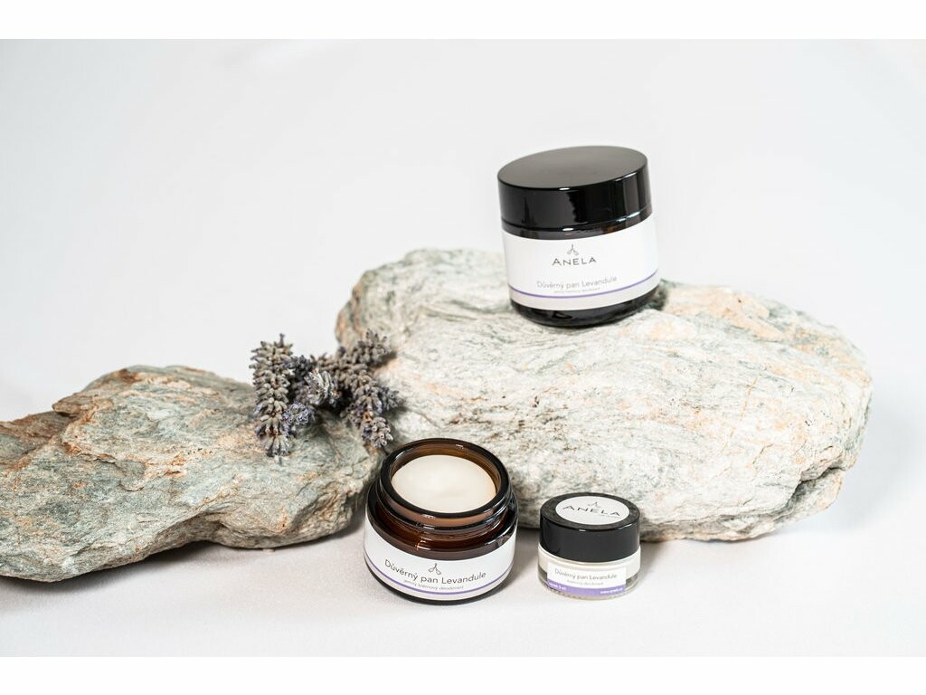 Die Grundlage der Důvěrní pánové ist ein sehr fein gemahlenes Pulver aus Natron, kombiniert mit Pfeilwurzstärke, Triethylcitrat, Kokosöl und Sheabutter. Diese Zutaten ergeben zusammen eine feine und glatte Creme, die Sie leicht mit den Fingern in die Achselhöhlen auftragen können. Soda, Kokosöl und Triethylcitrat verhindern die Aktivität von Bakterien im Schweiß und reduzieren so unangenehmen Geruch. Stärke absorbiert effektiv Feuchtigkeit und hält die Achseln trocken. Bio-Sheabutter und ausgewählte Trockenöle pflegen die Achselhaut sanft ohne fettiges Gefühl. Duftender Lavendel beruhigt eventuelle Reizungen sowohl der Haut als auch Ihres Geistes und versetzt Sie in das sonnige, entspannte Provence.