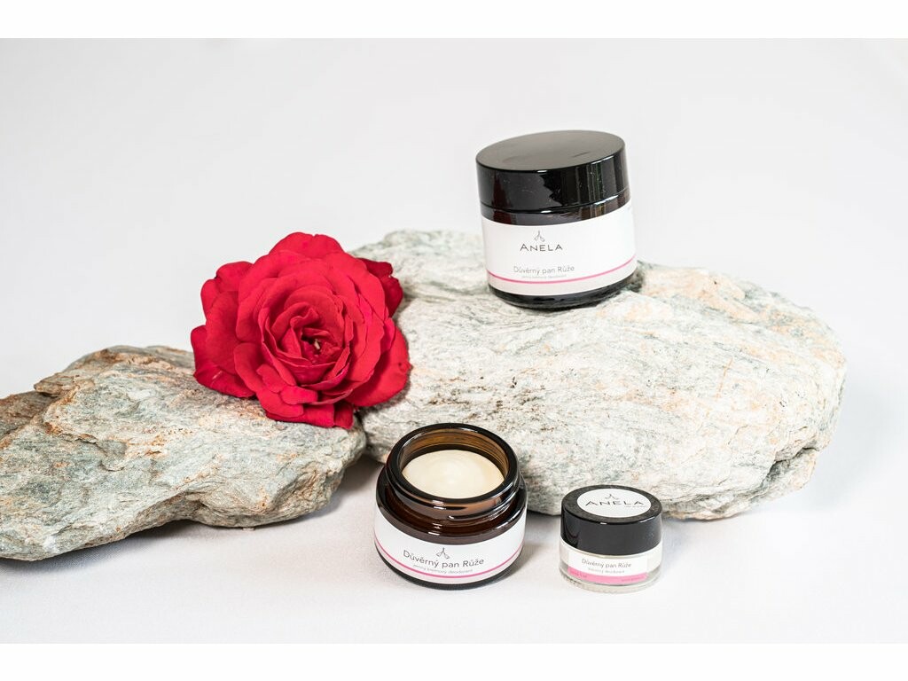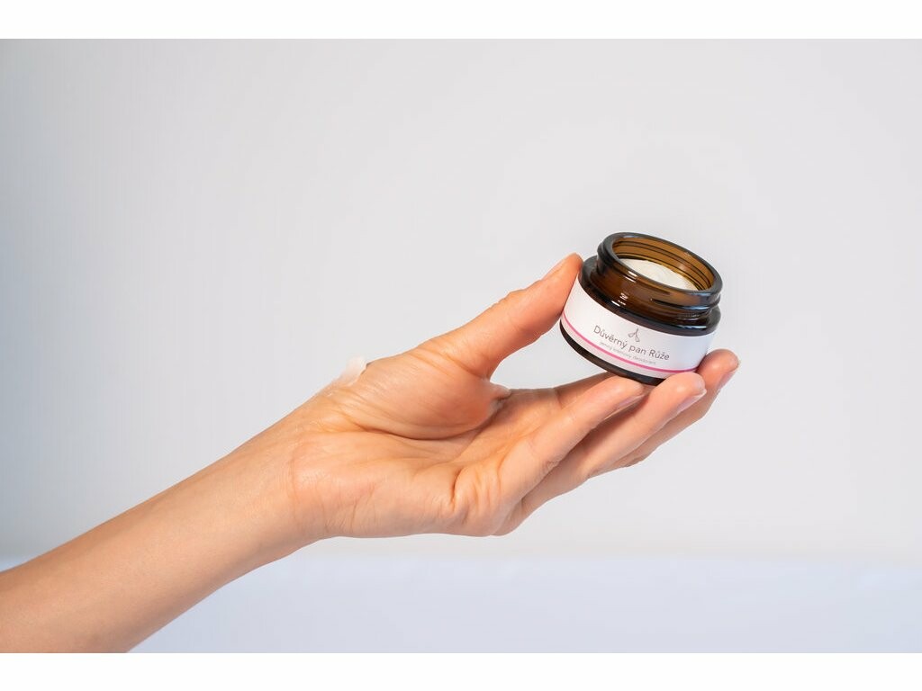 Die Grundlage der Důvěrní pánové ist ein sehr fein gemahlenes Pulver aus Natron, kombiniert mit Pfeilwurzstärke, Triethylcitrat, Kokosöl und Sheabutter. Diese Zutaten ergeben zusammen eine feine und glatte Creme, die Sie leicht mit den Fingern in die Achselhöhlen auftragen können. Soda, Kokosöl und Triethylcitrat verhindern die Aktivität von Bakterien im Schweiß und reduzieren so unangenehmen Geruch. Stärke absorbiert effektiv Feuchtigkeit und hält die Achseln trocken. Bio-Sheabutter und ausgewählte Trockenöle pflegen die Achselhaut sanft ohne fettiges Gefühl. Der süße Duft der Rose wird Ihre Stimmung heben, alle Sorgen vertreiben und Ihnen ein selbstbewusstes Gefühl von Weiblichkeit verleihen.