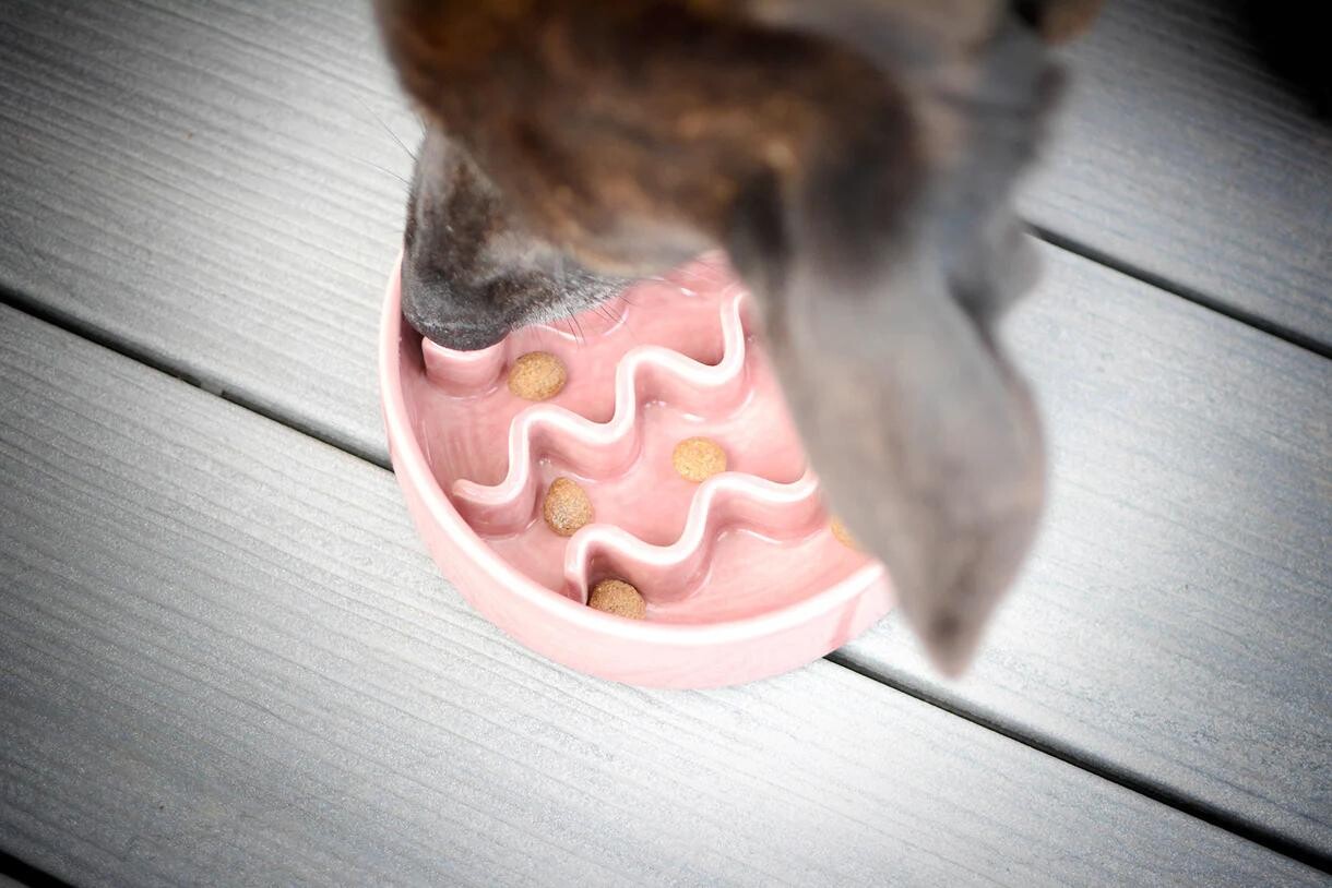 - Hilft, einer Magendrehung vorzubeugen: Die Verlangsamung der Nahrungsaufnahme beugt Risiken im Zusammenhang mit dem Schlingen von Nahrung und Verschlucken vor.
