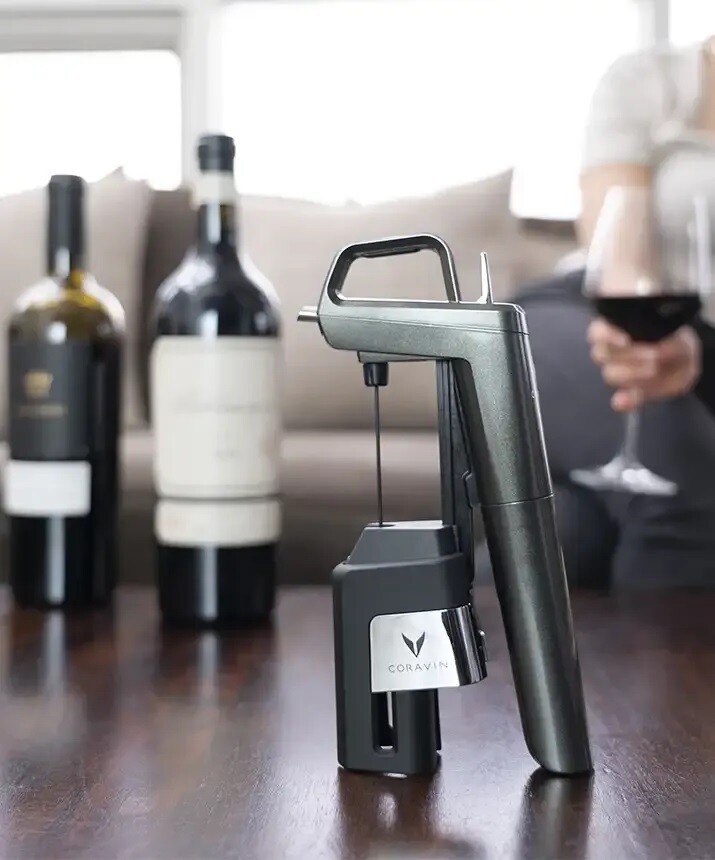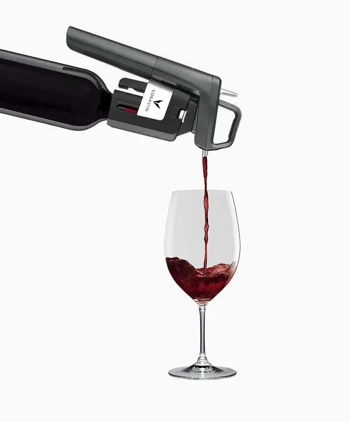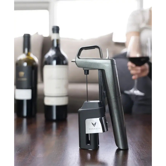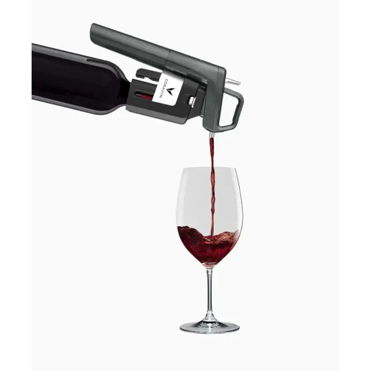 Verwendung: Das Coravin-Gerät wird an den Flaschenhals angelegt, den Sie mit einem intelligenten Mechanismus zum Zentrieren der Nadel auf die Achse des Korkens klemmen. Dann drücken Sie mit einer fließenden Bewegung auf die Oberseite des Geräts und die Coravin-Nadel durchdringt den Korken, ohne ihn wesentlich zu beschädigen.