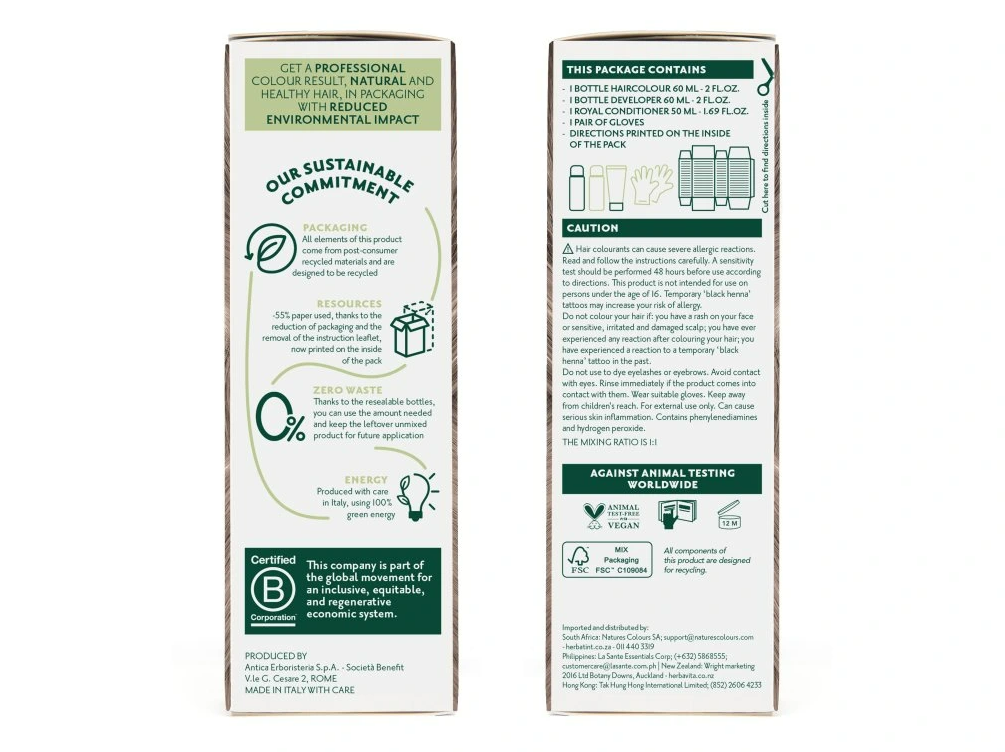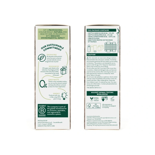 Innovierte Verpackung: kleinere Schachtel, aber größerer Inhalt! 5 % weniger verwendetes Papier im Vergleich zur vorherigen Verpackung dank der verkleinerten Schachtelgröße und dem Entfernen des Beipackzettels.Die Anleitung finden Sie jetzt auf der Innenseite der Schachtel gedruckt. Im Paket finden Sie anstelle von Proben 50 ml Royal Conditioner, der dank seines sauren pH-Werts das Haar verschließt und die Farbe für langanhaltenden Glanz hervorhebt.