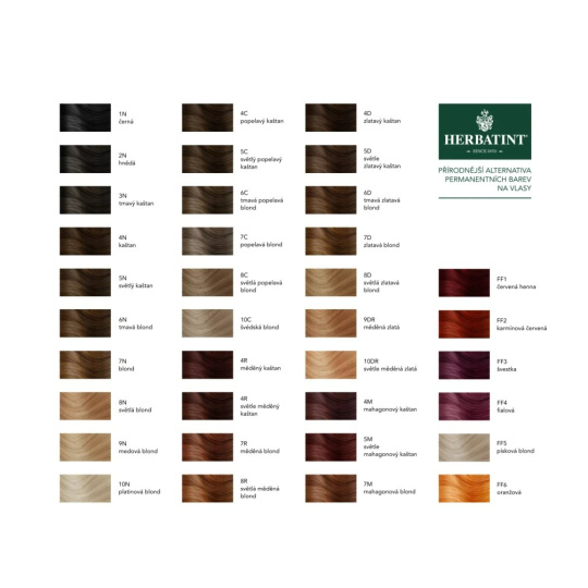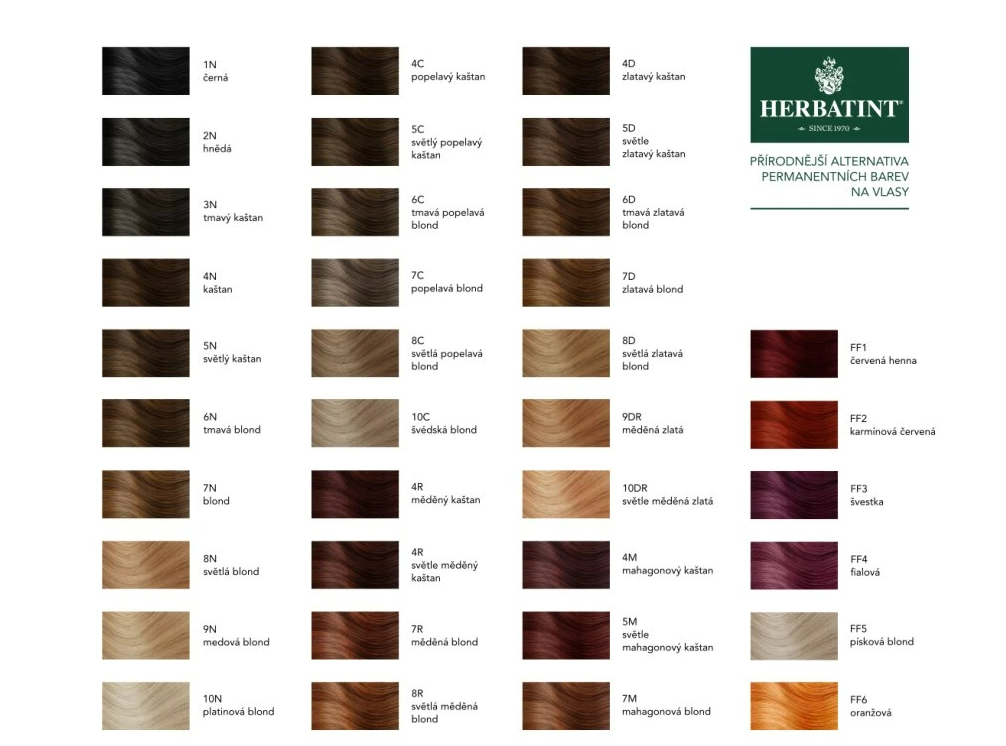 Die Farbe verleiht dem Haar eine intensive Farbe und Glanz. Das Haar sieht frisch aus, ist regeneriert, seidig glatt und gestärkt. Dank der gelartigen Konsistenz lässt sich die Farbe sehr einfach auftragen und ist völlig geruchlos. Der gesamte Färbeprozess dauert nicht länger als 40 Minuten. Außerdem testet Herbatint seine Produkte nicht an Tieren und ist auch für Veganer geeignet. Auf unserem Blog können Sie sich den Farbkatalog aller Farben ansehen, die wir im E-Shop anbieten. Vergessen Sie nicht, dass die resultierende Farbe nach dem Färben nicht immer mit der Farbe auf der Verpackung übereinstimmen muss. Es hängt von der ursprünglichen Haarfarbe ab, dem genetisch bedingten Pigment in der Struktur Ihres Haares, das sich möglicherweise nicht in der natürlichen Haarfarbe zeigt, aber einige Herbatint-Farben können es hervorheben; außerdem von der aktuellen Farbe (d.h. welche Farbe vor Herbatint aufgetragen wurde), oder ob Sie Nachwuchs, graue Haare oder Strähnchen haben.