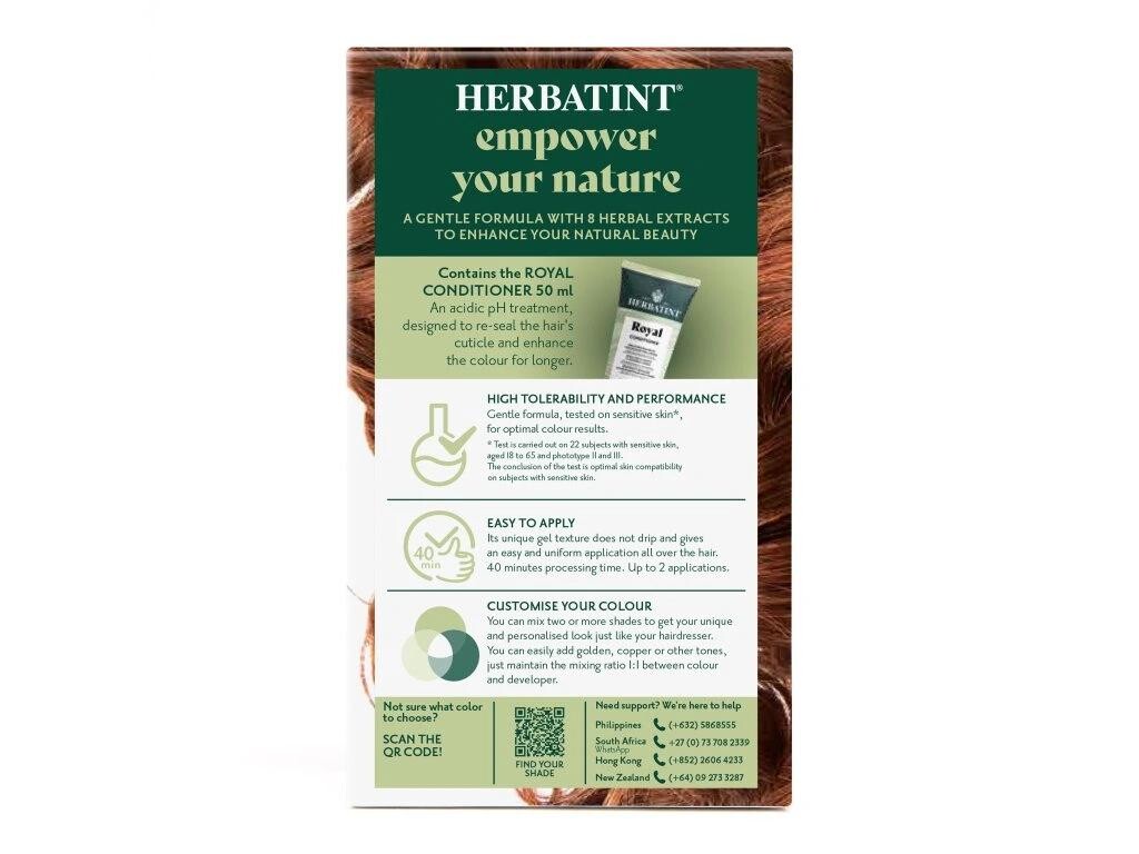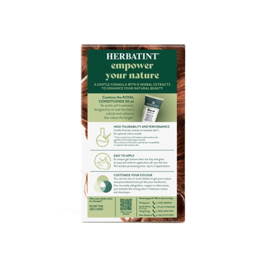 Die Farbe verleiht dem Haar eine intensive Farbe und Glanz. Das Haar sieht frisch aus, ist regeneriert, seidig glatt und gestärkt. Dank der gelartigen Konsistenz lässt sich die Farbe sehr einfach auftragen und ist völlig geruchlos. Der gesamte Färbeprozess dauert nicht länger als 40 Minuten. Außerdem testet Herbatint seine Produkte nicht an Tieren und ist auch für Veganer geeignet. Auf unserem Blog können Sie sich die Farbmuster aller Farben ansehen, die wir im E-Shop haben. Vergessen Sie nicht, dass die resultierende Farbe nach dem Färben nicht immer mit der Farbe auf der Verpackung übereinstimmen muss. Es hängt von der ursprünglichen Haarfarbe ab, dem genetisch bedingten Pigment in der Struktur Ihres Haares, das sich möglicherweise nicht in der natürlichen Haarfarbe zeigt, aber einige Herbatint-Farben können es hervorheben; außerdem von der aktuellen Farbe (d.h. welche Farbe vor Herbatint aufgetragen wurde), oder ob Sie Nachwuchs, graue Haare oder Strähnchen haben.