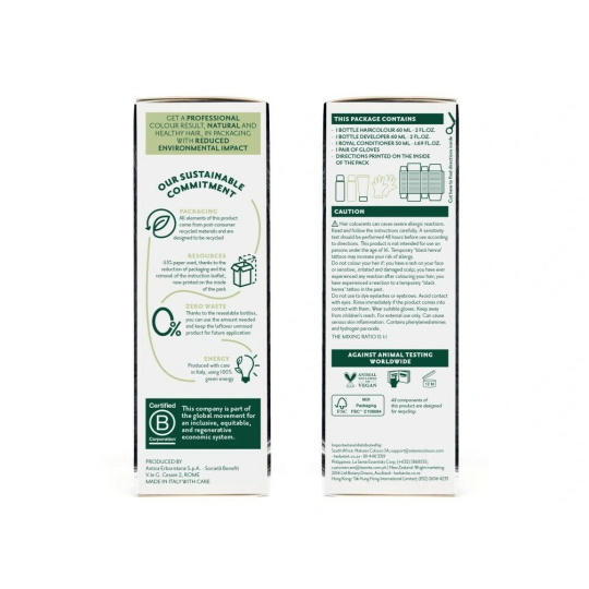Innovative Verpackung: kleinere Schachtel, aber größerer Inhalt!Um 5 % weniger verwendetes Papier im Vergleich zur vorherigen Verpackung dank der verkleinerten Schachtelgröße und dem Entfernen des Beipackzettels.Die Anleitung finden Sie jetzt auf der Innenseite der Schachtel gedruckt. Im Paket finden Sie anstelle von Proben 50 ml Royal Conditioner, der dank seines sauren pH-Werts das Haar verschließt und die Farbe für langanhaltenden Glanz hervorhebt.