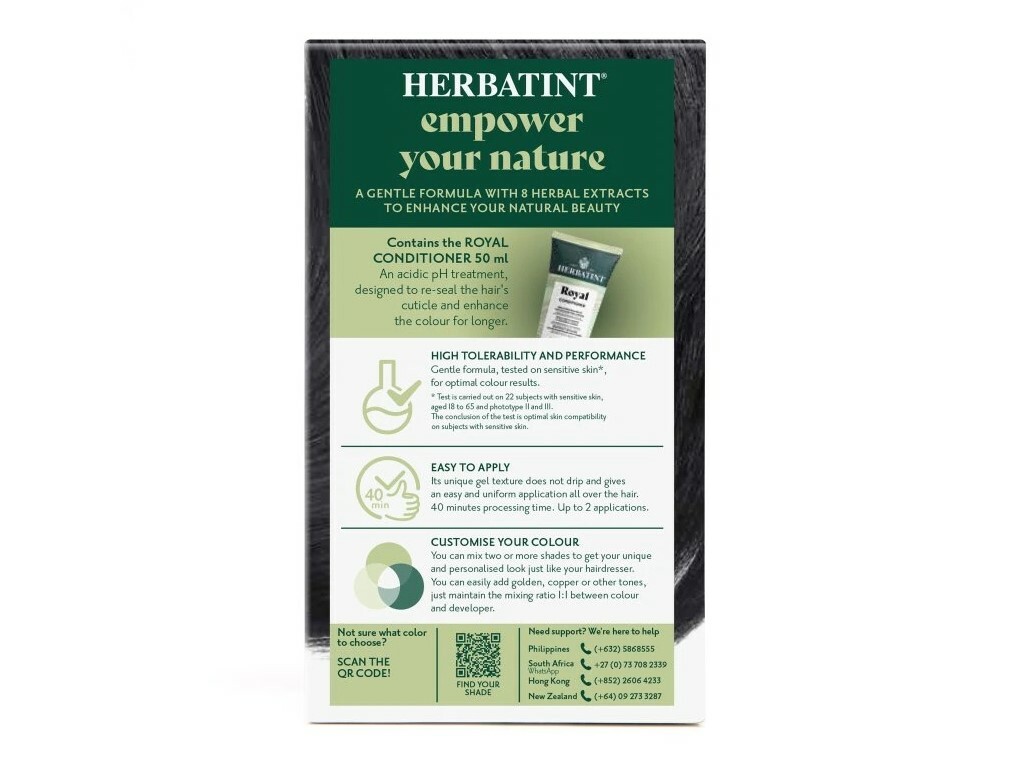 Die Farbe verleiht dem Haar eine intensive Farbe und Glanz. Das Haar sieht frisch aus, ist regeneriert, seidig glatt und gestärkt. Dank der gelartigen Konsistenz lässt sich die Farbe sehr einfach auftragen und ist völlig geruchlos. Der gesamte Färbeprozess dauert nicht länger als 40 Minuten. Außerdem testet Herbatint seine Produkte nicht an Tieren und ist auch für Veganer geeignet. Auf unserem Blog können Sie sich die Farbkarte aller Farben ansehen, die wir im E-Shop anbieten. Vergessen Sie nicht, dass die resultierende Farbe nach dem Färben nicht immer mit der Farbe auf der Verpackung übereinstimmen muss. Es hängt von der ursprünglichen Haarfarbe ab, dem genetisch bedingten Pigment in der Struktur Ihres Haares, das sich möglicherweise nicht in der natürlichen Haarfarbe zeigt, aber einige Herbatint-Farben können es hervorheben; außerdem von Ihrer aktuellen Farbe (d.h. welche Farbe vor Herbatint aufgetragen wurde), oder ob Sie Nachwuchs, graue Haare oder Strähnchen haben.