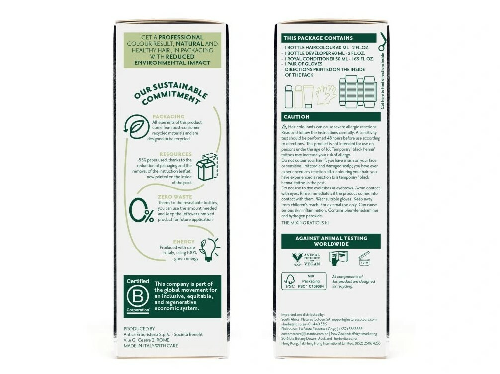 Innovative Verpackung: kleinere Schachtel, aber größerer Inhalt!Um 5 % weniger verwendetes Papier im Vergleich zur vorherigen Verpackung dank der verkleinerten Schachtelgröße und dem Entfernen des Beipackzettels.Die Anleitung finden Sie jetzt auf der Innenseite der Schachtel gedruckt. Im Paket finden Sie anstelle von Proben 50 ml Royal Conditioner, der dank seines sauren pH-Werts das Haar verschließt und die Farbe für langanhaltenden Glanz hervorhebt.