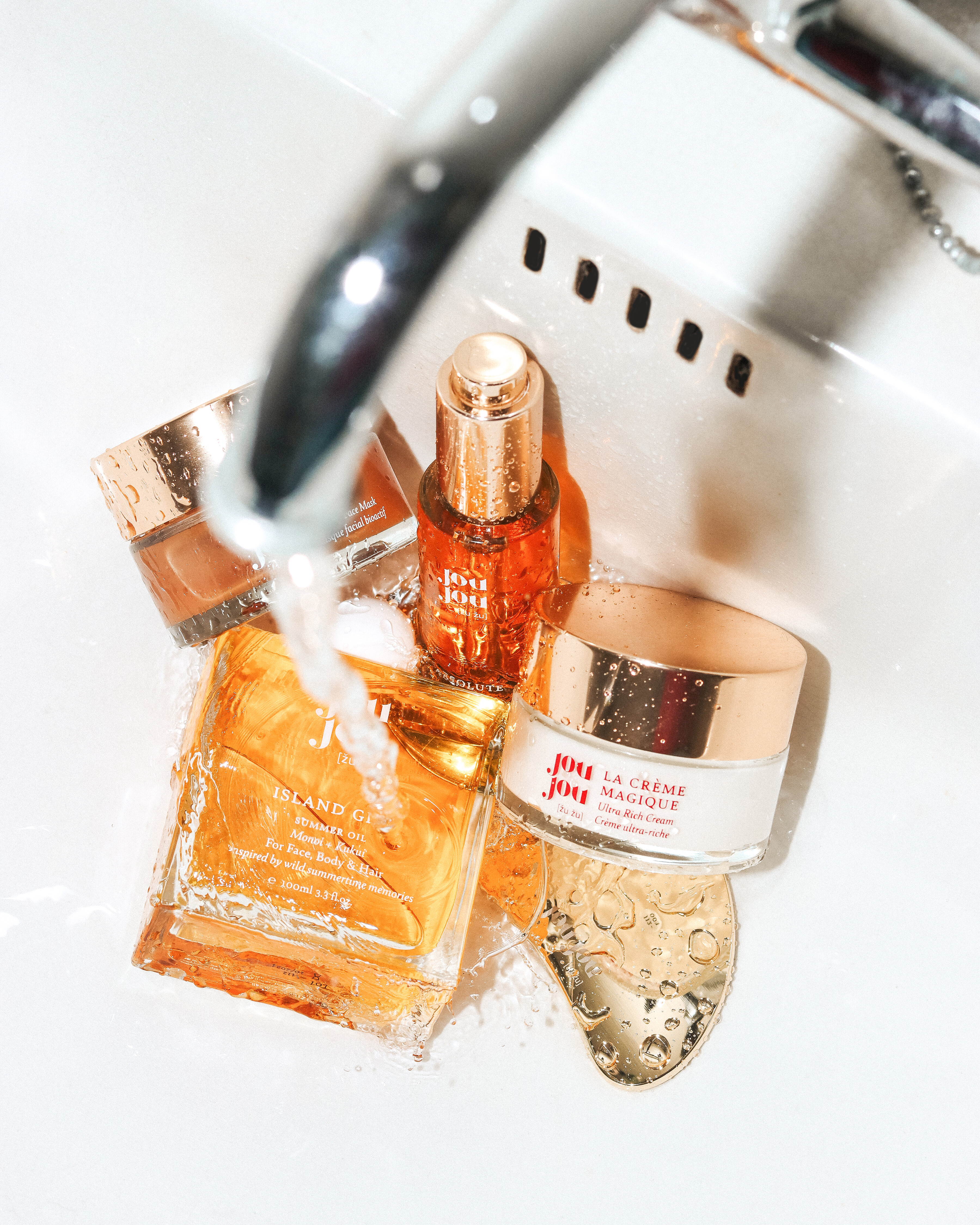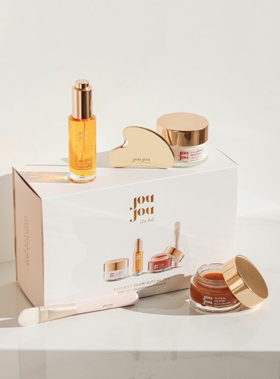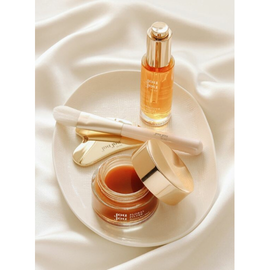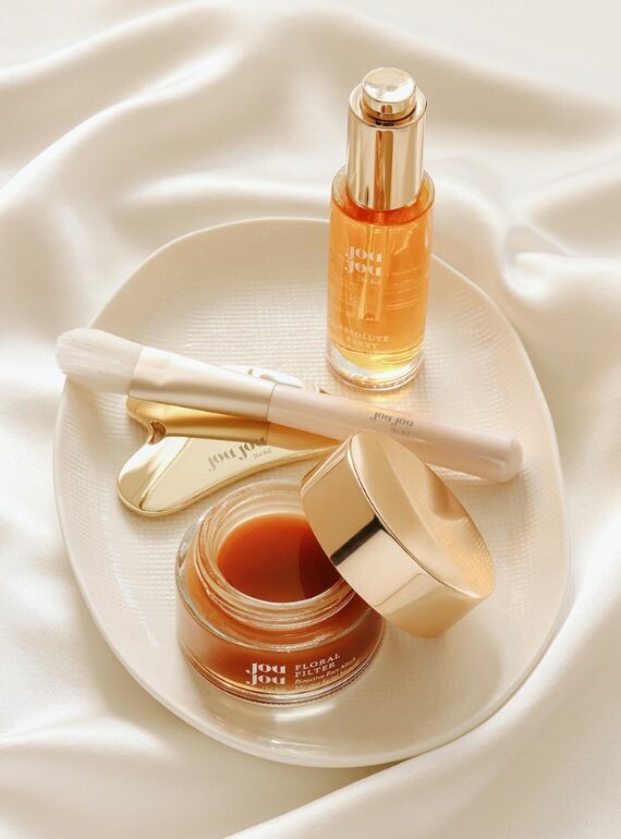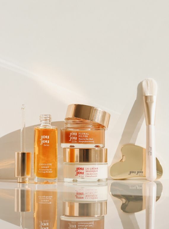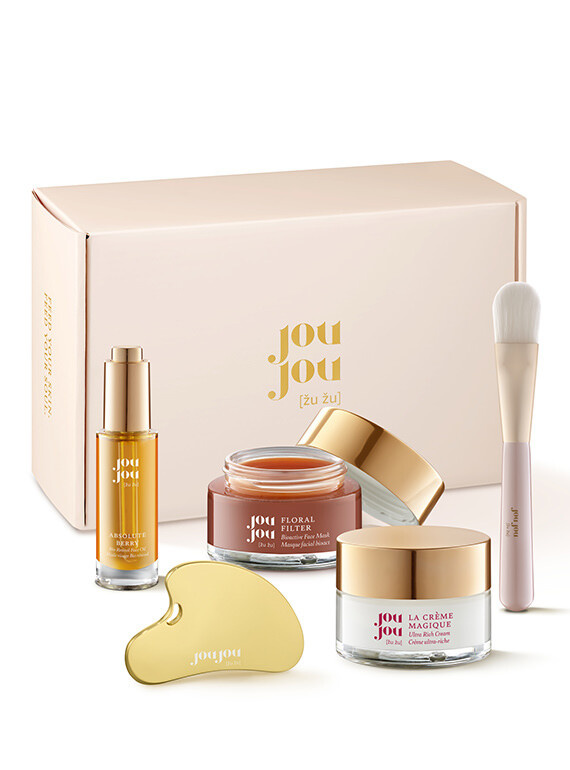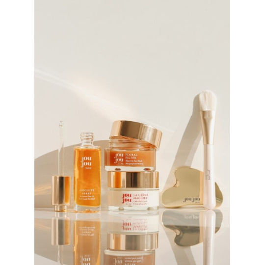 Drei unserer Bestseller, Gesichtsöl mit Bio-Retinol Absolute Berry, Reichhaltige Creme La Créme Magique und Gesichtsmaske mit Blumenfilter, sind jetzt mit zwei speziellen Geschenken verbunden, die Ihr Hautpflegeritual ergänzen: dem markeneigenen Gua Sha JouJou Gesichtsmassagetool und dem JouJou Maskenpinsel.