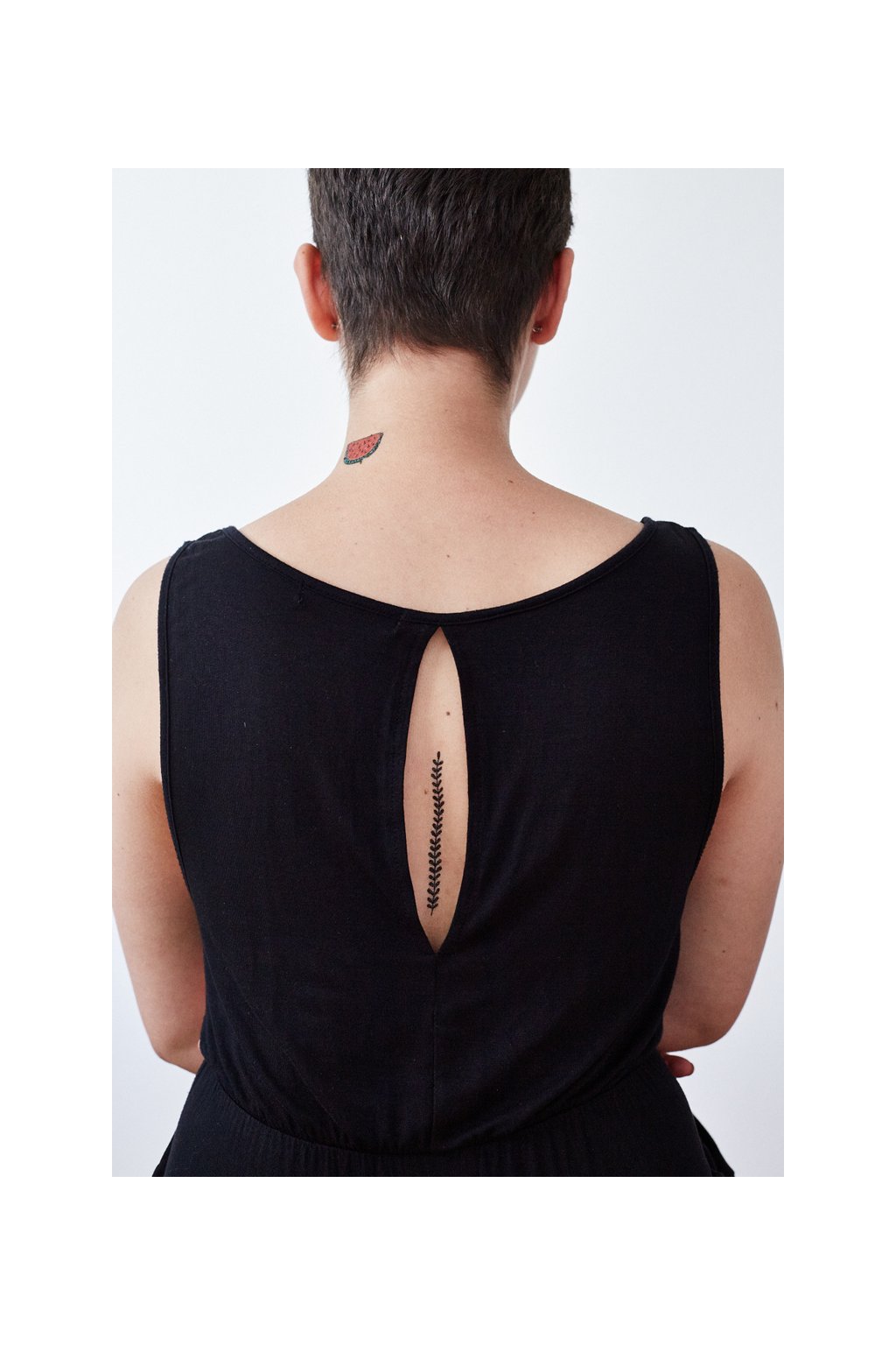 Schwarze Tätowierungen mit natürlichen Motiven, die keine Farben benötigen, um zu strahlen.Dermatologisch getestet. Sicher für Kinder.