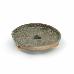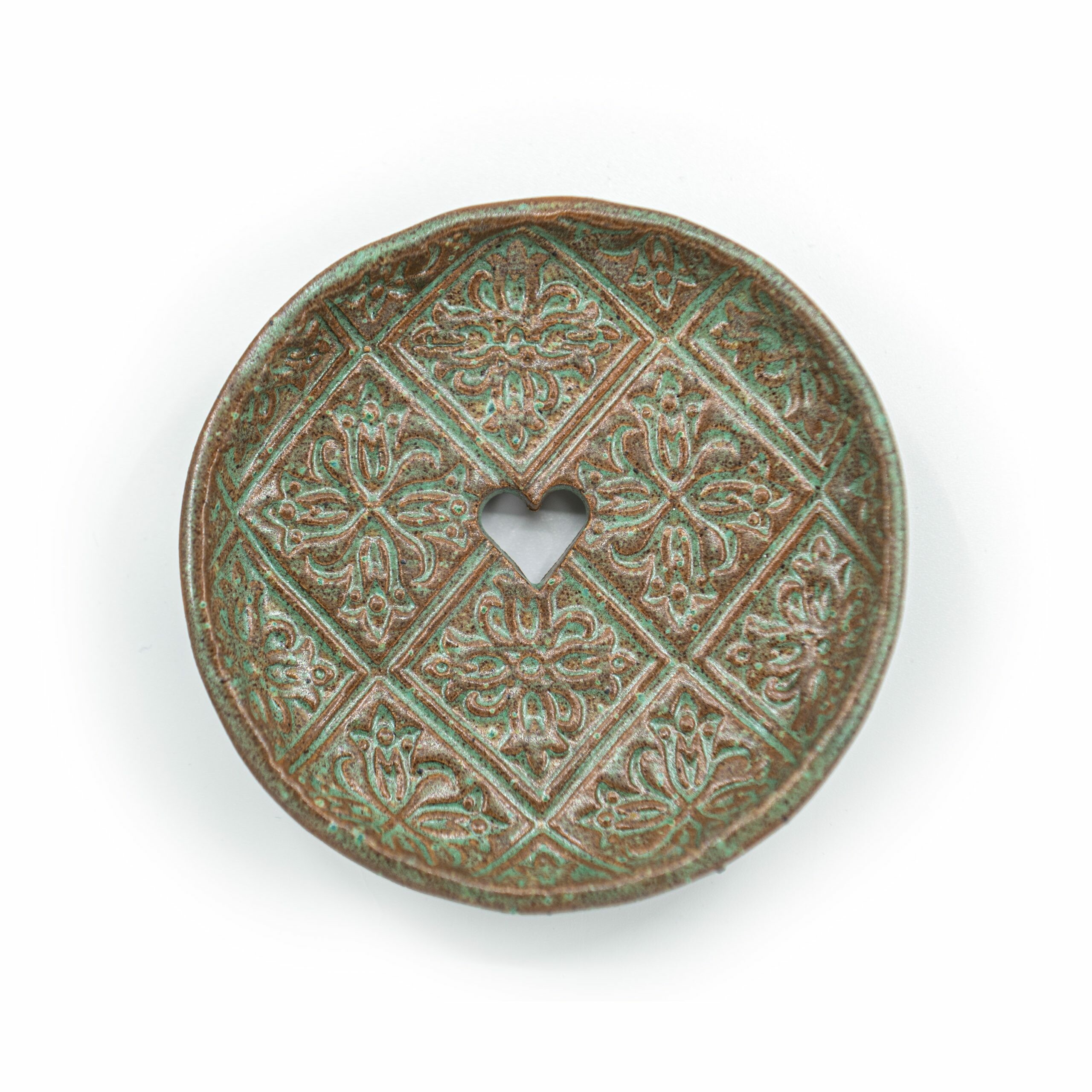Shampoohalter für feste Shampoos auf Füßchen, mit herzförmiger Öffnung für den Wasserabfluss. 100% handgefertigt: modelliert, bemalt, glasiert.