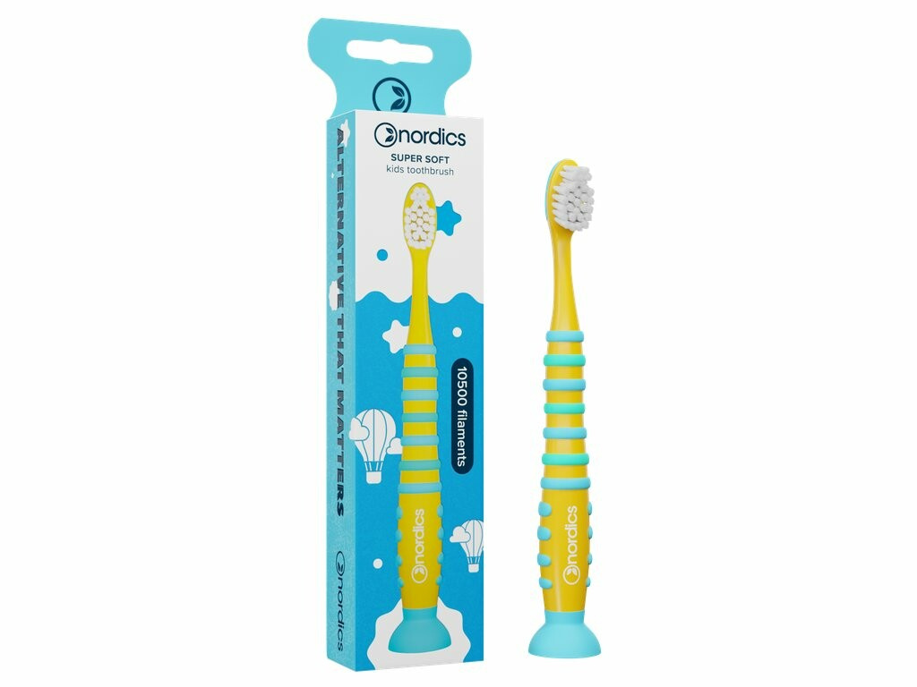 Zahnbürste für Kinder mit 10.500 Borsten in der Härte SUPER SOFT. Der Griff besteht aus lebensmittelechtem Silikon für einen einfachen Halt und am Ende befindet sich ein Saugnapf.