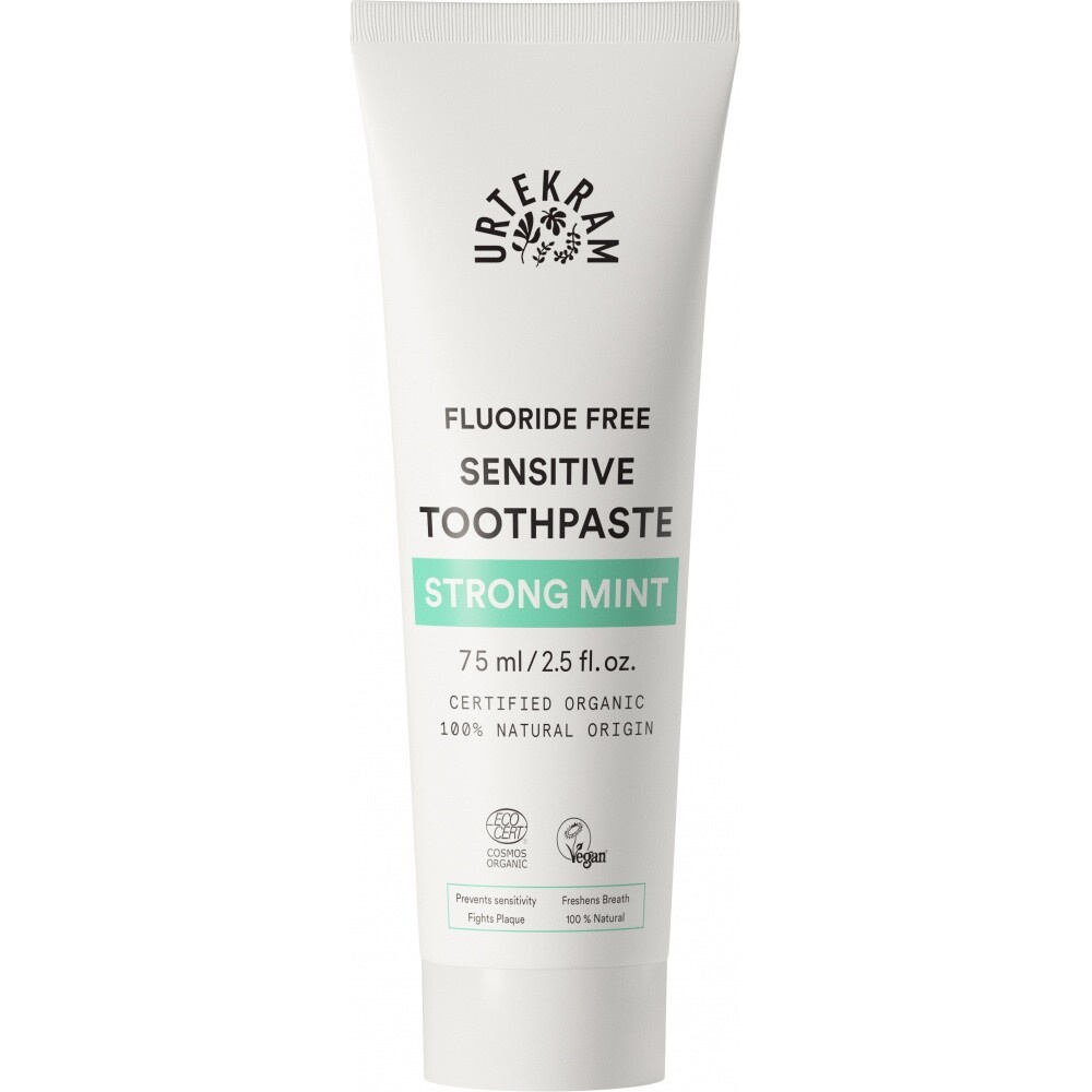 Die Zahnpasta Urtekram Sensitive mit stark erfrischendem Minzgeschmack reinigt, schützt und pflegt auch extrem empfindliche Zähne und Zahnfleisch perfekt. Die Zahnpasta verhindert Zahnempfindlichkeit, wirkt effektiv gegen Karies und Plaque, stärkt den Zahnschmelz, stellt das richtige mikrobiologische Gleichgewicht wieder her und beugt der Bildung von Zahnstein vor. Die Zahnpasta schäumt nicht.