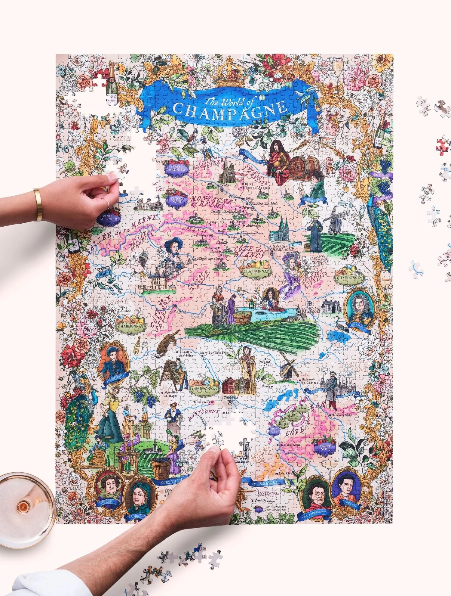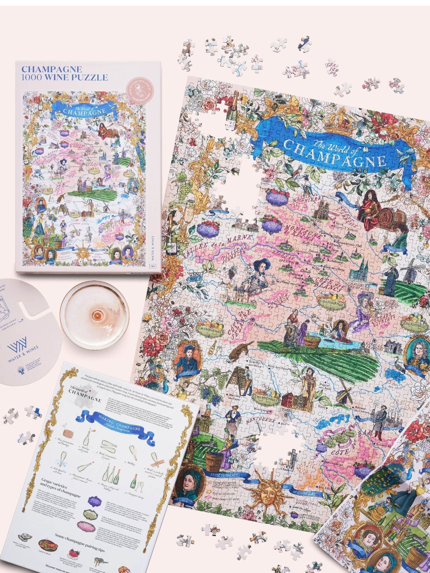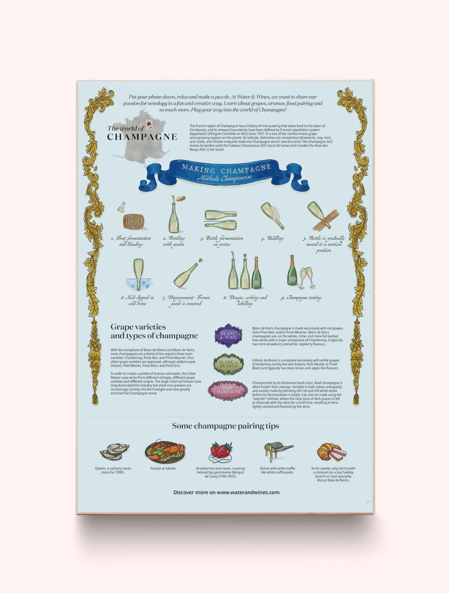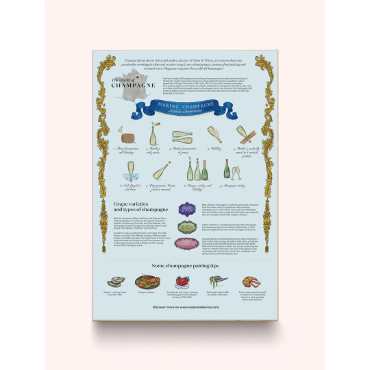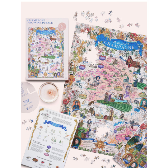Puzzle, die die Hauptregionen der Champagne, die Grand Cru-Dörfer und die reiche Geschichte der Region darstellen. Das handgemalte Bild entstand in Zusammenarbeit mit dem Weinmeister und Champagner-Spezialisten Essi Avellan, die Illustration stammt von Derek Fenech. In der Schachtel finden Sie zusammen mit den Teilen und dem Poster auch viele Informationen über die Herstellung von Champagner und Tipps zur Kombination mit Speisen!