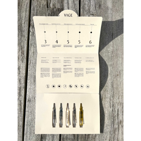 Yage Bestseller-Proben-Set enthält ein Tonikum, eine feuchtigkeitsspendende Essenz, ein Tages- und Nachtserum und ein Nachtgesichtsöl. Diese Kollektion ermöglicht es Ihnen, 5 Schlüsselprodukte von Yage auszuprobieren, verpackt in einem Kartonumschlag.